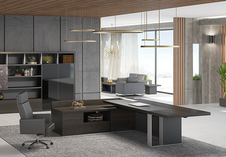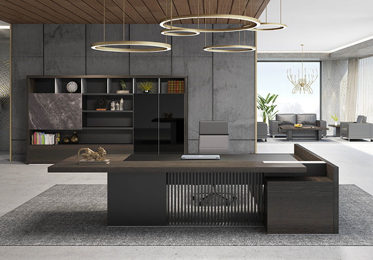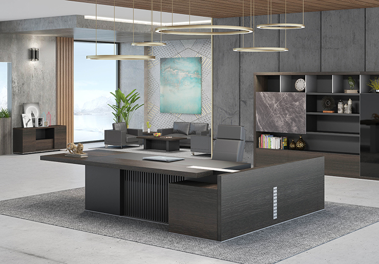 3、結(jié)構(gòu):臺(tái)面復(fù)合厚度60mm,3個(gè)模塊組成,主臺(tái)面為捫皮工藝,輔臺(tái)面為泰坦胡桃,與附柜連接臺(tái)面為拉絲鋁合金裝飾。臺(tái)腳采用45度拼接結(jié)構(gòu),拉米諾連接方式。工藝高端附柜配置多功能集成插座。附柜配置了抽屜,掩門以及預(yù)留了主機(jī)位,線路收納等存儲(chǔ)空間。附柜掩門及抽屜門板拉手為隱藏式設(shè)計(jì)。配套門鉸和導(dǎo)軌均為德國進(jìn)口品牌