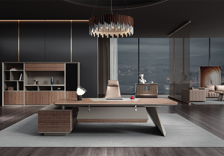4.桌面中纖板基材,高檔尼絲木皮貼面,雙層貼合設(shè)計,總厚度6cm,四周倒斜角處理;采用五底三面油漆封邊工藝;線槽位鑲嵌拉絲不銹鋼,美觀精致紋理清晰;寫字位選用優(yōu)質(zhì)超纖皮革飾面;